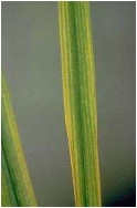 Plant height and tiller number can be affected. Older leaves turn to orange-yellow color and leaf tips are pale-colored. Leaf blades are wavy and droopy. Occurrence of necrosis on older leaves and orange colored.