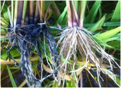 - Freshly uprooted rice hills often have poorly developed root system with many black roots, which are covered with a uniform and smooth orange-brown coating of Fe3+ oxides and hydroxides.