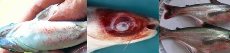 • Red mouth, red body, or red spots disease are commonly observed with pangasius during the culturing or rearing stage or the nursery stage, caused by the bacteria Aeromonas hydrophila.