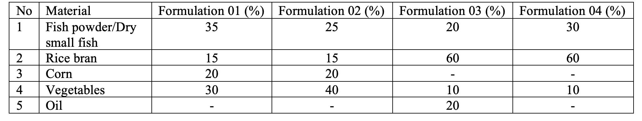 • Homemade feed: Available in pellets and ball, low cost, using different raw materials depending on the region, but the protein content is not clear content. Processing takes a lot of time and labor.